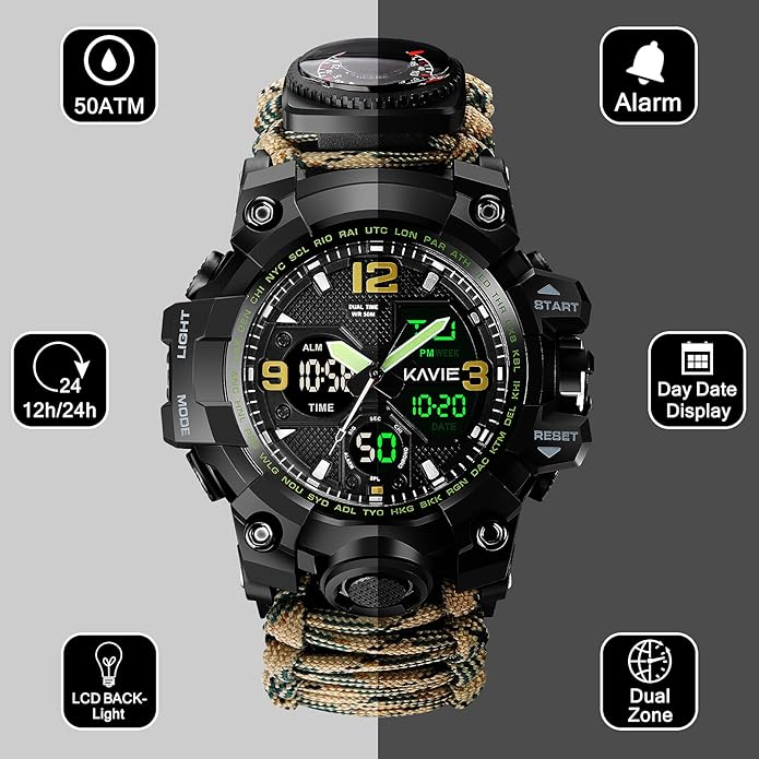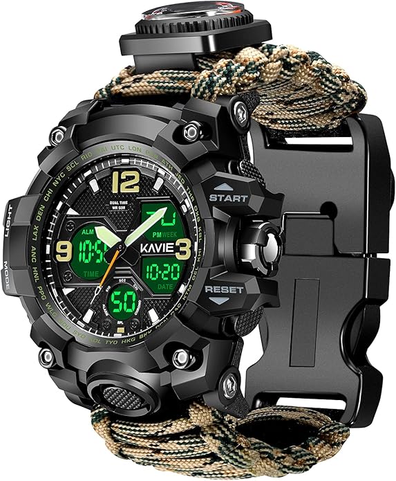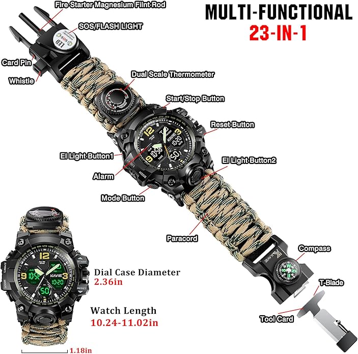 - 【23-IN-1 Military Survival Watch】:When you are exploring in the wild, you may face the danger of life and death. An emergency outdoor survival equipment artifact is born. It contains time dual display/Paracord/Fire Starter/survival whistle/SOS Led light/card pin/compass/thermometer/tool card/bottle opener/bicycle banner etc. 23kinds of powerful functions, high-quality, multi-functional, safe and practical survival watch.