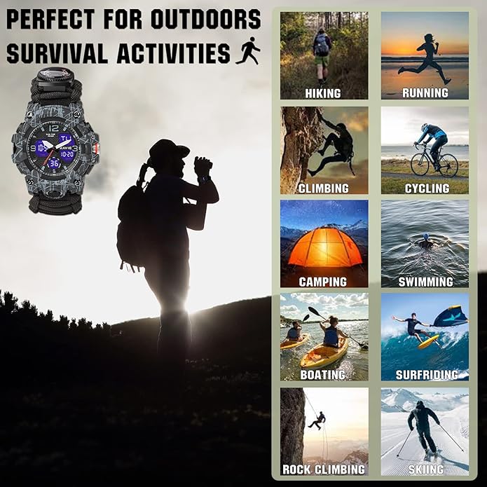 - 【Suitable for Daily Life, Adventure, Gift】: This sports watch is suitable for any situation, You can wear it in daily lifes just for lesure and beauty. Unique design and multifunctional usage,It is a great gift for your friends or relatives. Especially suitable for Outdoor Outings, Field Adventures, Outdoor Recreation, First Aid, Mountaineering, Climbing, Adventure and Military.