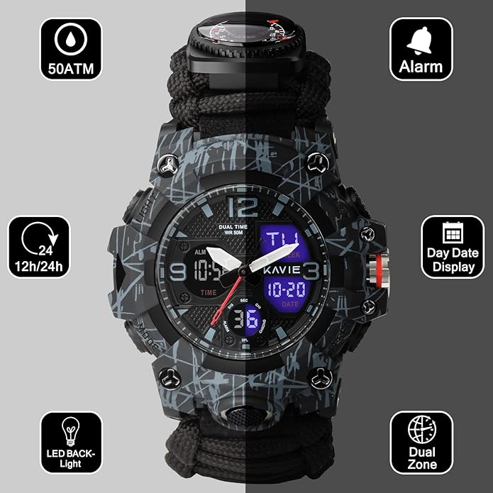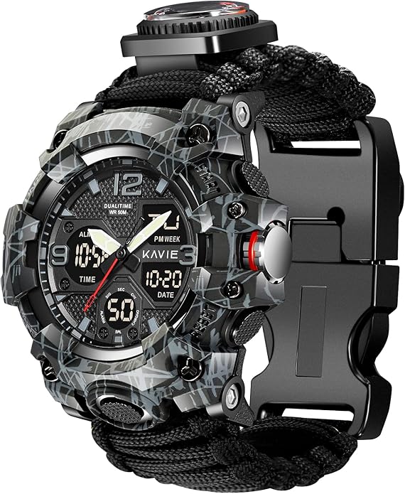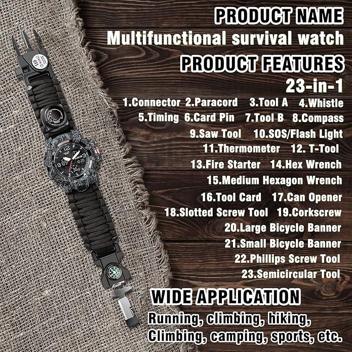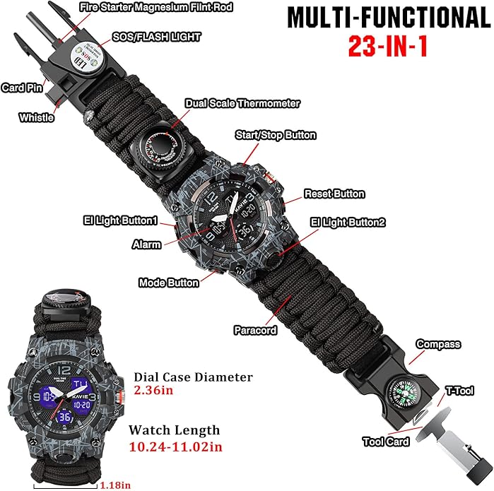 - 【23-IN-1 Military Survival Watch】:When you are exploring in the wild, you may face the danger of life and death. An emergency outdoor survival equipment artifact is born. It contains time dual display/Paracord/Fire Starter/survival whistle/SOS Led light/card pin/compass/thermometer/tool card/bottle opener/bicycle banner etc. 23kinds of powerful functions, high-quality, multi-functional, safe and practical survival watch.