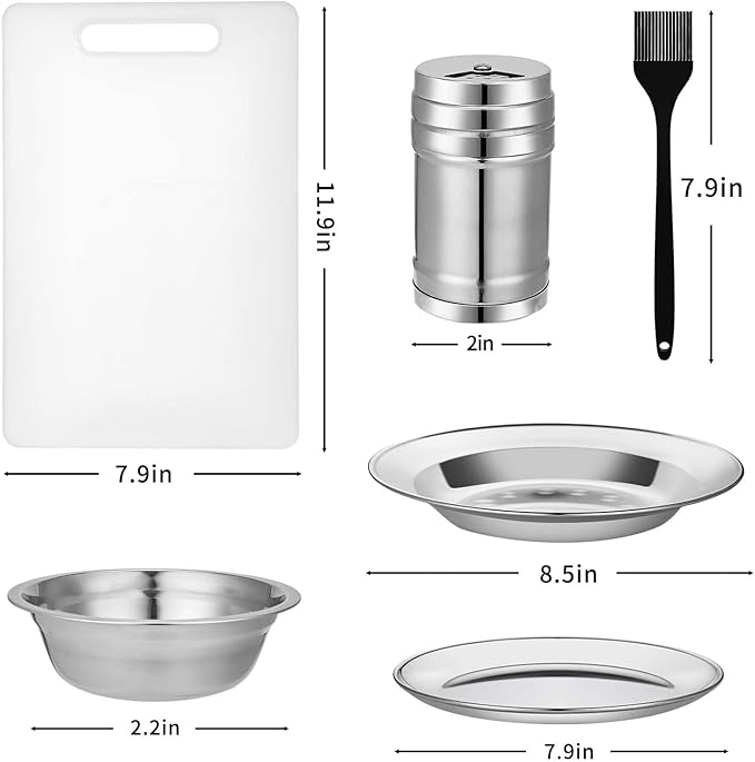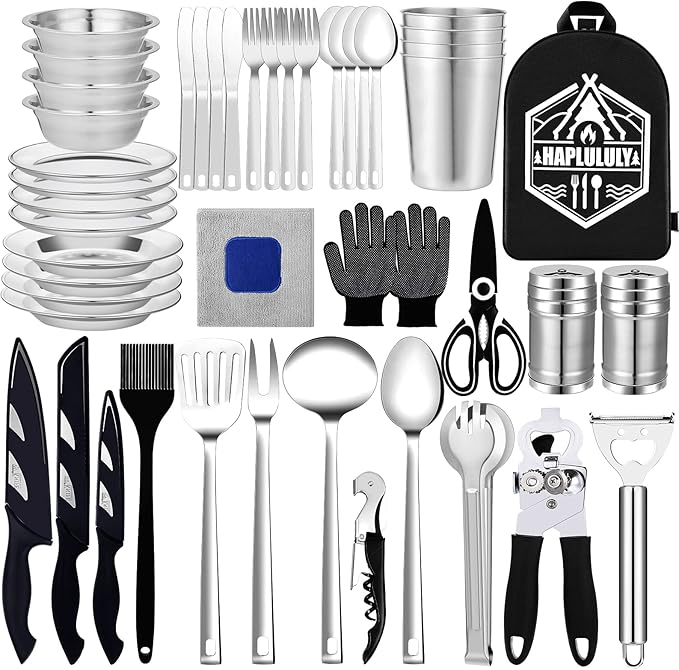- 🏕[What you can get] Everyone has their own unique uses for tools, This camping cookware set will solve all your needs. 1*Storage bag4* knives, forks and spoons1*Cutting board1*Barbecue fork1*frying pan spatula1*Soup spoon1*Cake spatula1*non-slip gloves1*clean towel1*bread clip1*peeler1*scissors1*chef knife1*Toast Knife1*Fruit knife1*BBQ Brush1*Bottle opener1*Multifunctional can opener2*Spices bottler。4*7.9inKorean style round plate 4*8.5in Dinner plate 4*6.2in bowl 4*10 ounce cup