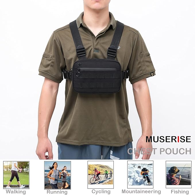 - 【Appropriate Size】The chest bag size is 9.0*6.3*2.0 inches, it can accommodate items that need to be carried with you for outdoor sports, such as mobile phones, keys, watches, wallets, skipping ropes, snacks, etc. The appropriate size is freeing your hands and will not increase the burden during exercise