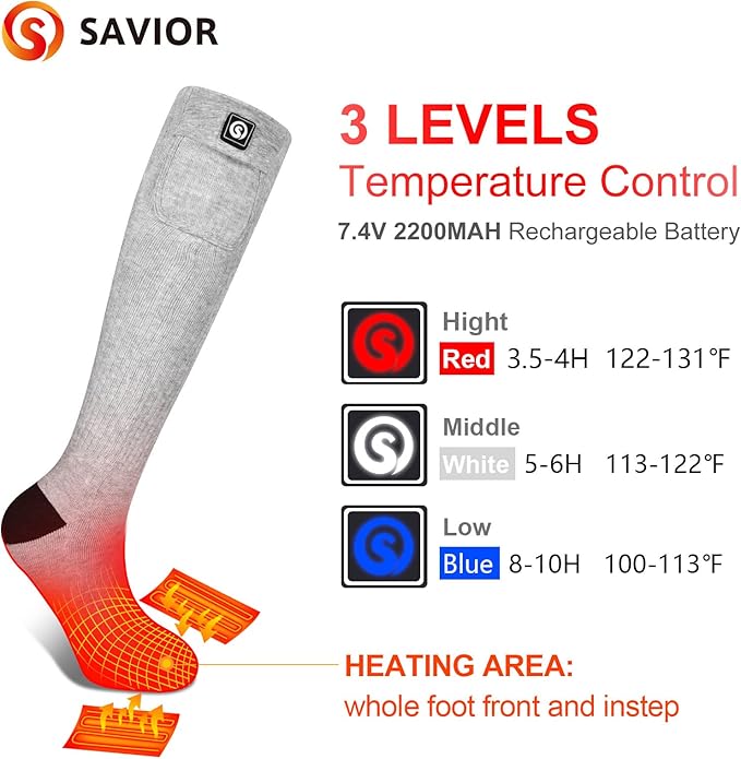 - 【7.4V 2200MAH Rechargeable Li-ion Batteries&Long Heating Hours】The Upgraded heated socks includes a pair 7.4V 2200MAH Li-ion rechargeable batteries. Battery full charge around 3-4 hours. Long-lasting heating, long life batteries, no longer afraid of the cold.