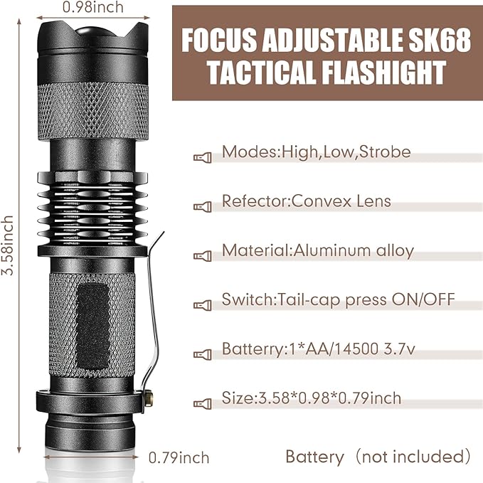 - Small size: the length of the LED flashlight is about 3.58 inch, and the diameter is about 0.98 inch, it's convenient to carry due to the small size, you can put it in your pocket wherever you go; And the LED flashlight has anti-skid design, so you can hold it firmly in your hand