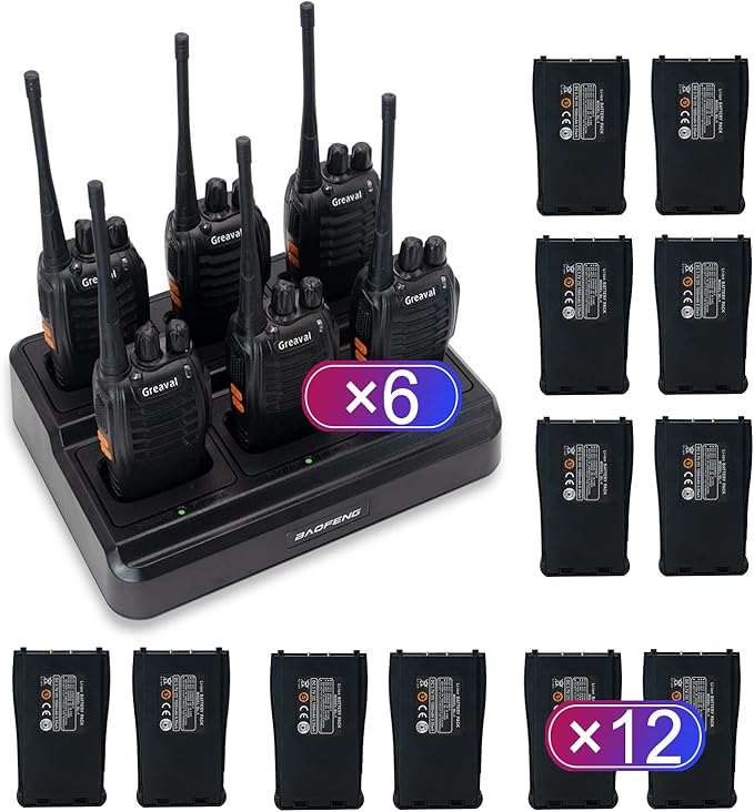 GV-8S Long Range Walkie Talkies with Six-Way Multi-Unit Charger for Adults, 6 Pack Rechargeable Walkie Talkies with 12 Li-ion Batteries, Two-Way Radio with Earpieces and Mic