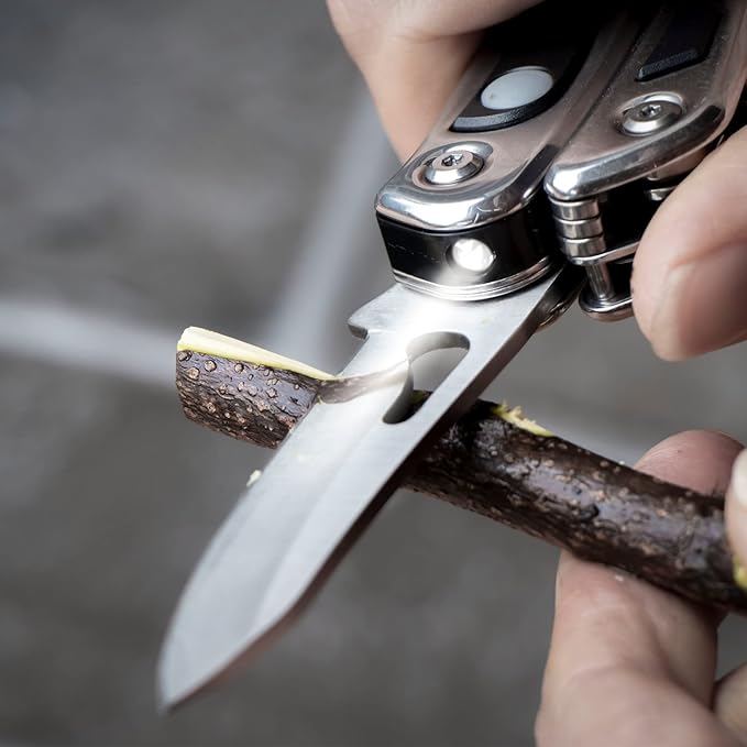 - Practical Tools Eight tools can be used without opening plier: sharp knife(5CR15Mo), 5# slotted screwdriver, 1# phillips screwdriver, scissors, 2 Led (front & rear), can opener, bottle opener, carabiner. The rear LED Light with spotlight lighting from farther away. Front LED light for vicinity such as turn screw in darkness, cutting in field's night.