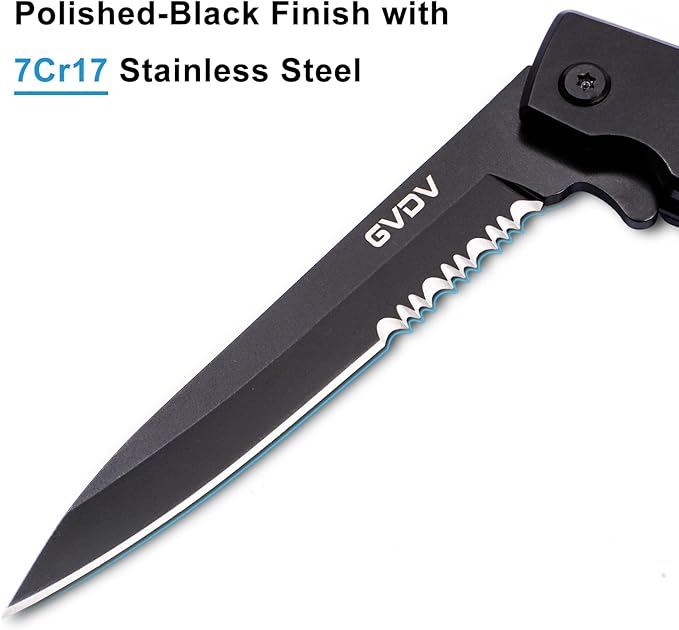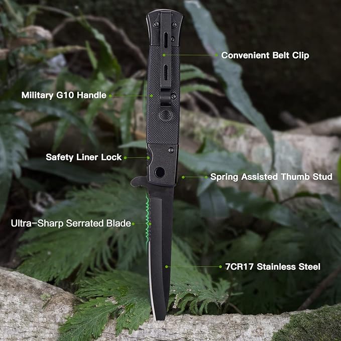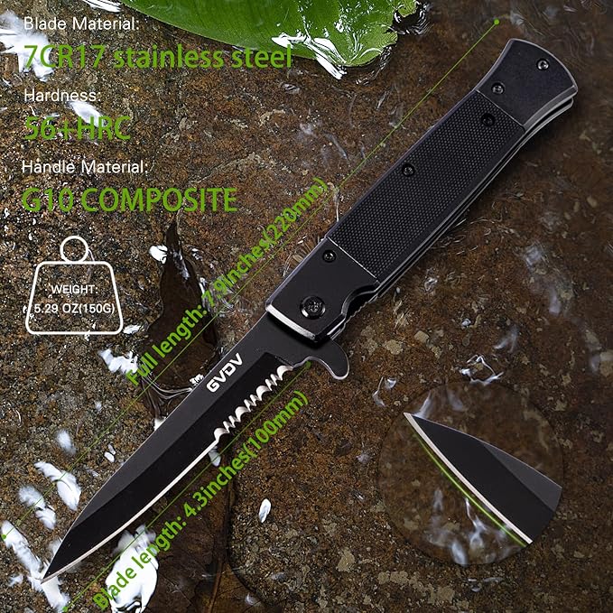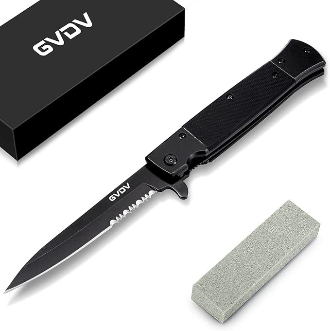 GVDV Folding Pocket Knife with G10 Handle, 7CR17 Stainless Steel EDC Knife with Safety Liner Lock, Hunting Camping Hiking Fishing Knife, Father's Day Gifts for Men Dad, Serrated