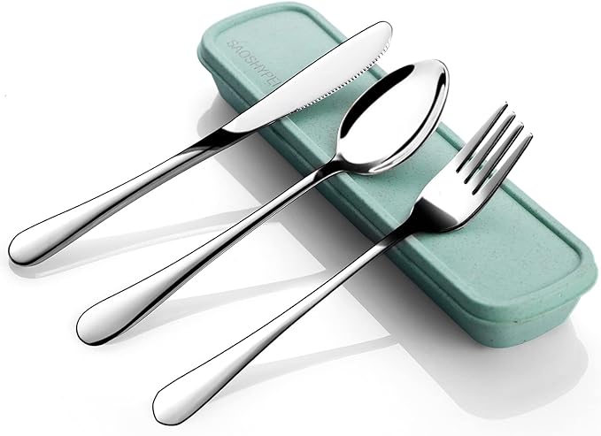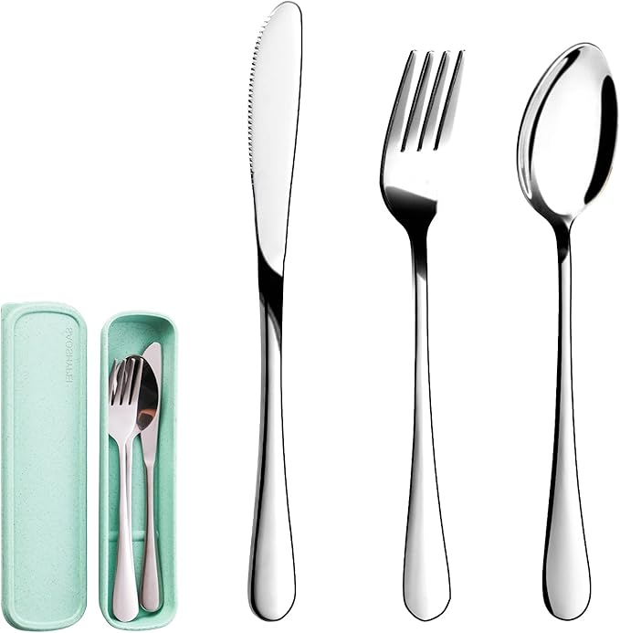 - 4-Piece Reusable Utensils with Case:includes 1 x dinner knife,1 x dinner fork, 1 x dinner spoon, plus 1 x travel flatware carrying case,suitable for restaurant, travel, camp, school or workplace...