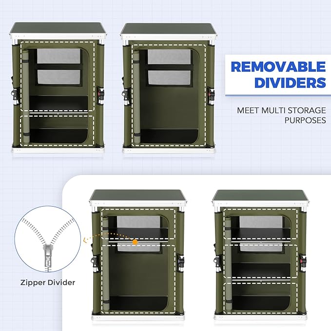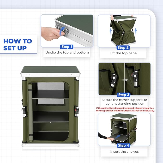 - BREATHABLE & EASY TO CLEAN: EAGLE PEAK portable camping table’s waterproof desktop and the 3 level shelves can be conveniently removed to clean when dirty. 2 mesh backside windows provide breathable airflow. NOTE:the table should not be used in the rain.