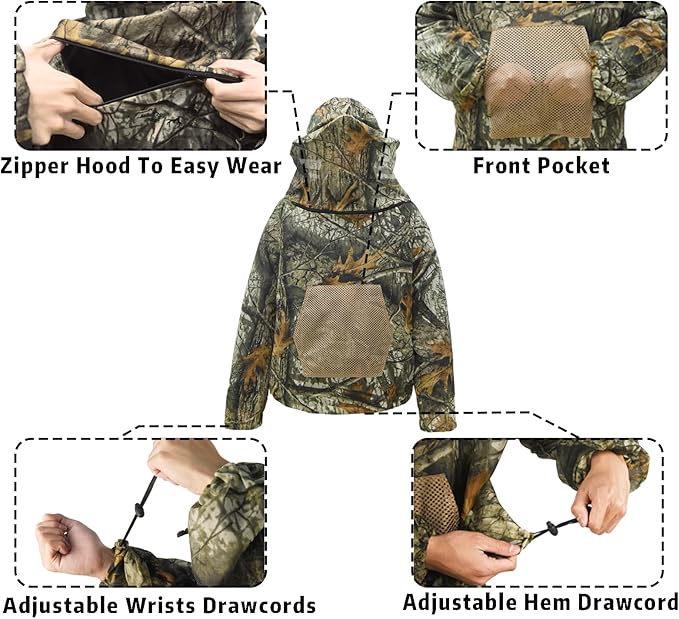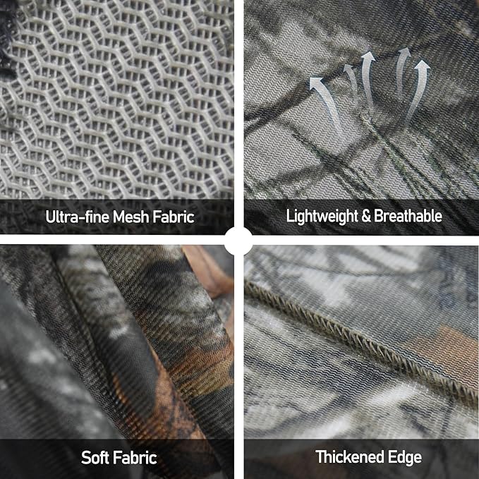 - Made of lightweight polyester fabric, the outside can be clearly seen through the mesh. This is a camouflage mosquito suit with high visibility, good breathability and ultra-fine mesh very suitable for outdoor Fishing, Camping, Hiking, Bee keeping, Climping and Gardening.