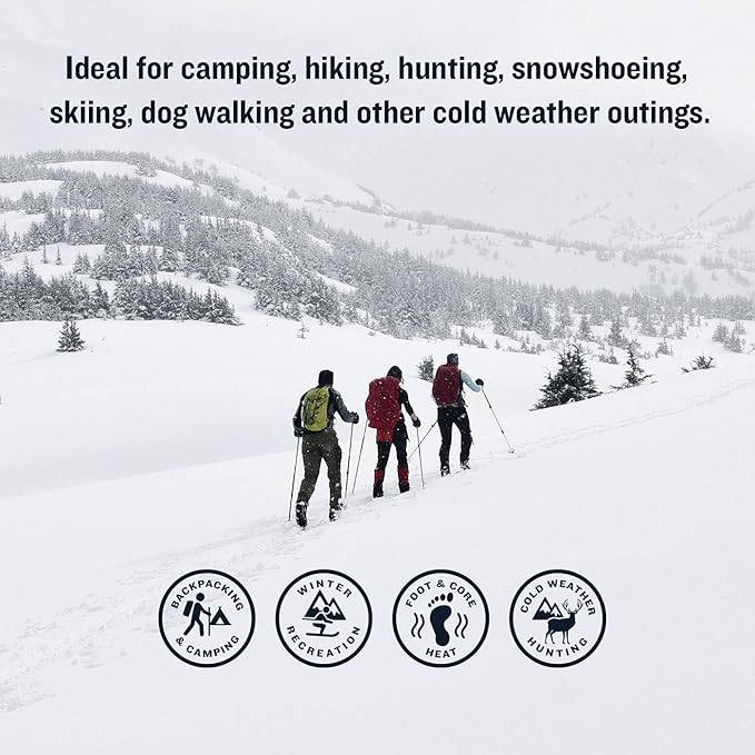 - Easily activated by removing from packaging and exposing to air; ideal for camping, hiking, hunting, snowshoeing, skiing, dog walking and other cold weather outings