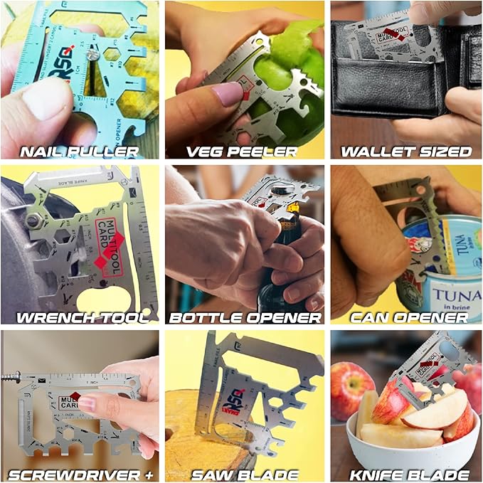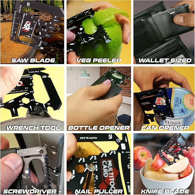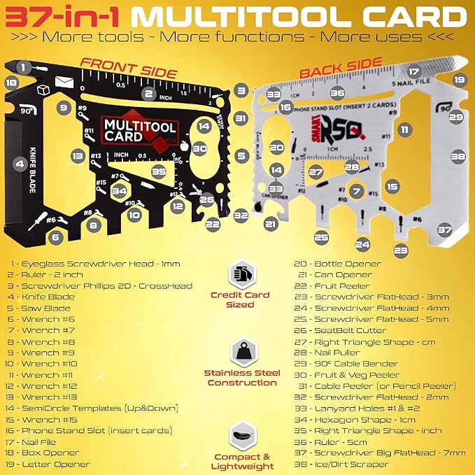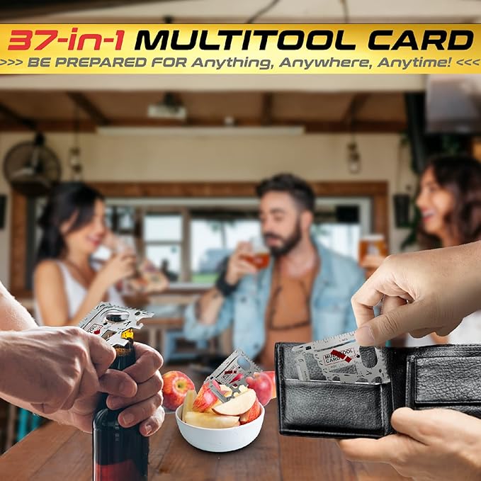 - 👉 ALL IN ONE WALLET TOOL - First 37-in-1 Survival Credit Card Multitool Gift Set with Original Design, Accessories & Functionalities. 💡BE PREPARED with the Mens Gifts Credit Card Multi Tools for Wallet whenever the situation demands it.