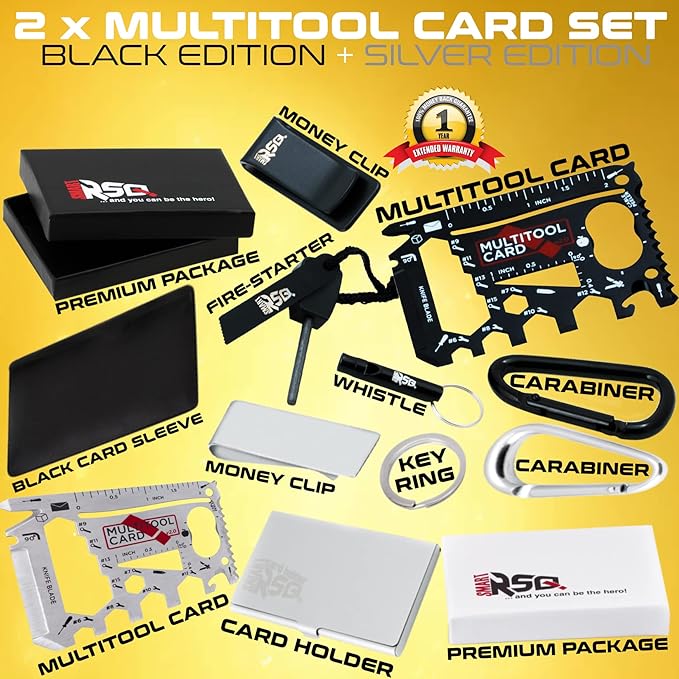 - 🎁 COMPLETE SET 1 - Black Credit Card Multitool for Men (37-in-1 Multipurpose Wallet Tool) + Useful Accessories (Sleeve Cover +English User Guide +Keyring +Fire-starter +Whistle +Money Clip +Carabiner) + Giftable Package (Stocking Stuffer Gadgets)