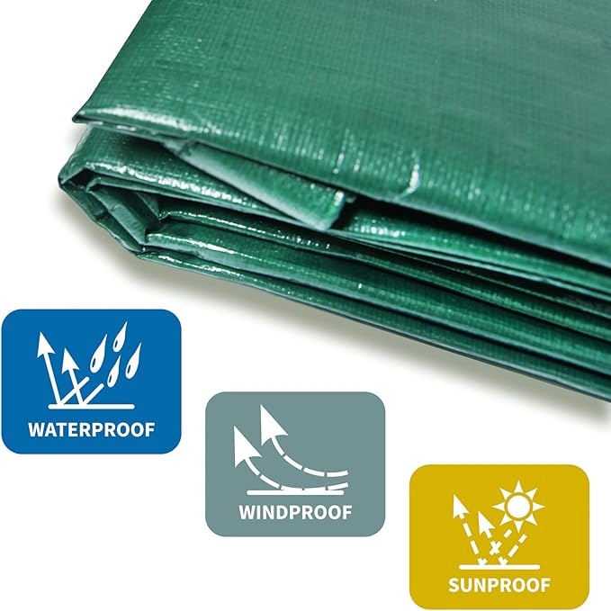 - High Qualtiy Fabric: Tongcamo tarp is made of high-density, tightly woven, made-to-last polyethylene fibers, UV protection against harmful sunrays and fading, waterproof, sunproof and windproof, can be applied to rain, shine, snow or wind all seasons. It has the strength, durability, woven tightly together and the plastic is laminated. The Green Brown Tarpaulin has a 10 mil thickness, 5 oz. per square yard, and a 12 x 14 weave count.