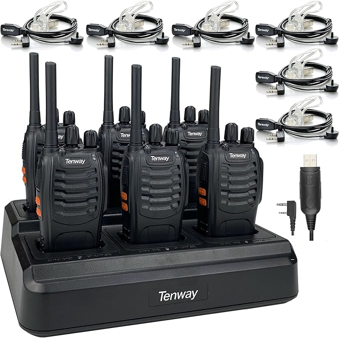 6Pack TW-888S Two Way Radio for Adult Long Range Rechargeable Handheld Walkie Talkie with Air Earpiece and Programming Cable and 6 Way Multi Unit Charger