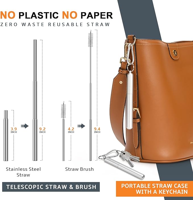- REUSABLE STRAW SET: There is also a portable metal drinking straw case in pack that contains a stainless steel straw and a straw brush that both can be telescoped into the case. Use the reusable straw, get no waste and say byebye to plastic and paper straws, do the sustainable things and try our best to protect our earth and seas.