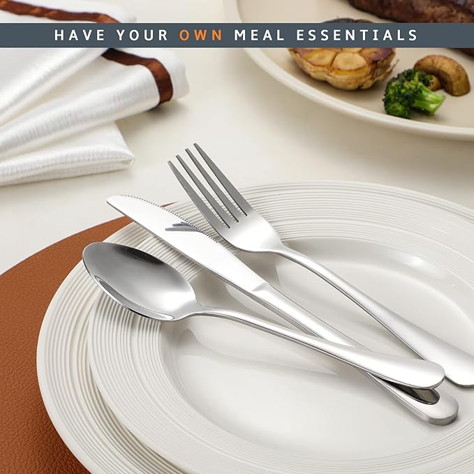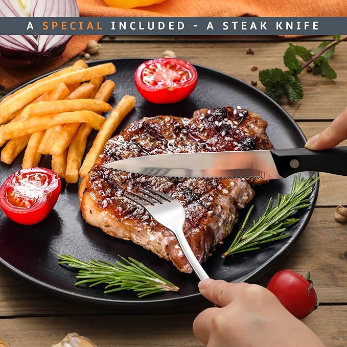 - ESSENTIALS FOR EATING: In this pack we have the basics for eating - a set of dinner spoon, a dinner knife and a dinner fork, and what special including than others is a sheathed steak knife for easy slicing meat and solid, coarser food. They all have the proper size and weight that are very handy for using outside or at the on-the-go meal.