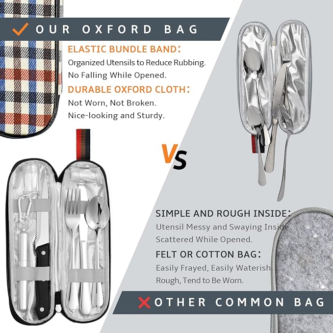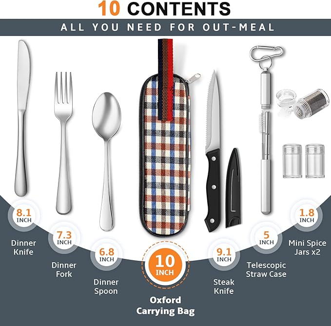 - ALL YOU NEED FOR OUT-MEALS: There comes on an easy-carry zipper-bag with a set of eating basis of a dinner fork, a dinner knife, a dinner spoon and a special included sheathed steak knife, two mini spice jars and a portable straw set which contains a telescopic straw and a straw brush. The elastic bundle bands inside help to organize utensils stay good in the bag and avoid messy and falling while zipper opened.