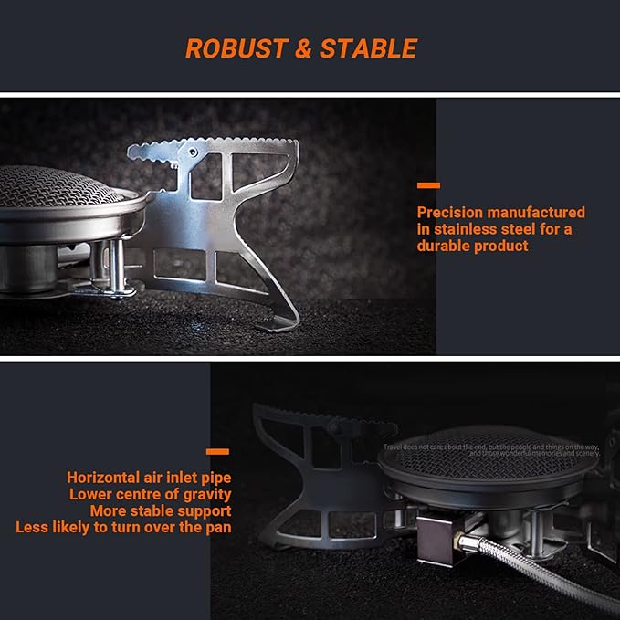 - Performance & Energy efficiency: The large honeycomb burner plate ensures strong and even firepower as well as improved wind protection for the camping stove. The air inlet and the hollow design increase energy efficiency and save gas. The gas cooker allows you to cook quickly in a few minutes without waiting.