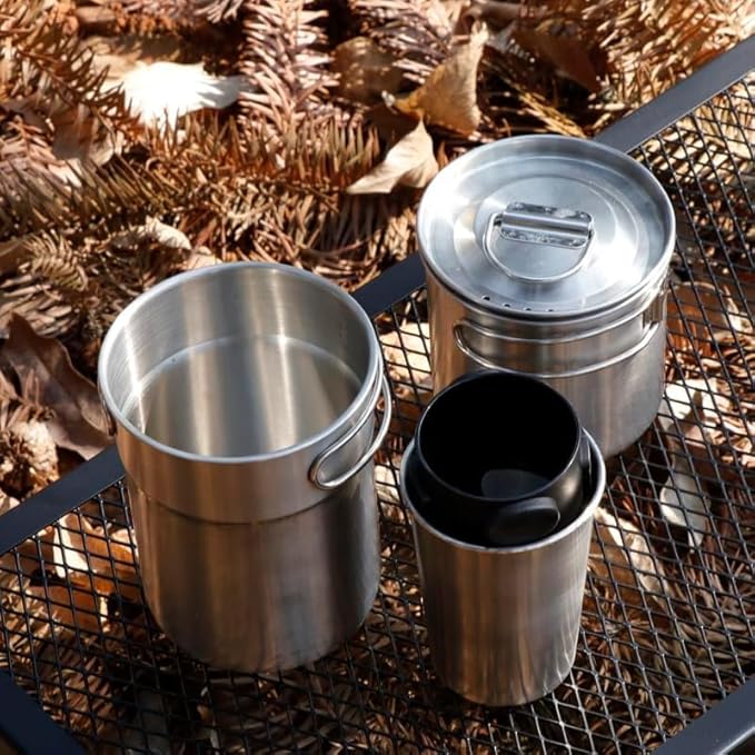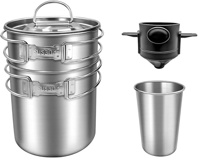 - Camping Pot Cooking Cup Set:Adaptable as a cup or a pot, the Outdoors Stainless Bottle is all in one! Including a 33oz big cup,24oz small cup,foldable Coffee Filter,Stainless steel camp cookware,lid with 4-spiracle and a cloth bag,great for cooking food,tea or coffee,when camping, hiking, backpacking, outdoor adventure and survival.