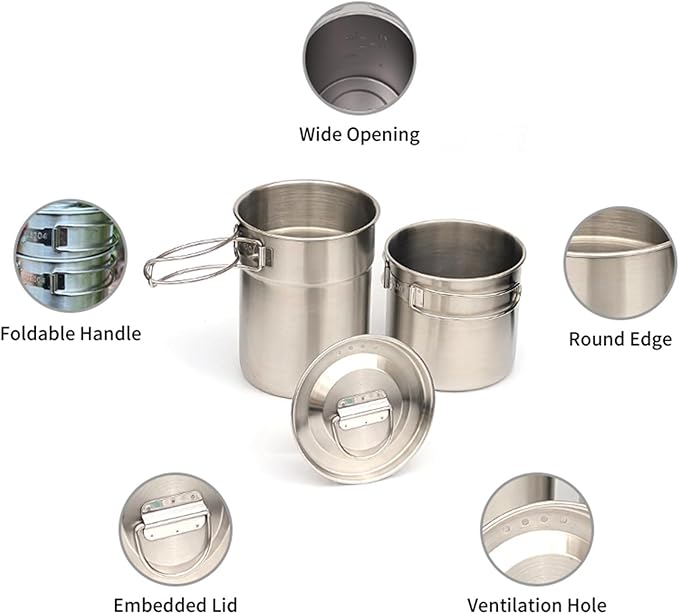 - Lid with 4-Spiracle: Camping pot stainless clip with a lid to prevent heat loss,and let steam escape when boiling. Lid round edges of versatile cup/pot is easy to clean after cooking soups and chili or used as a drinking handle for coffee and tea.