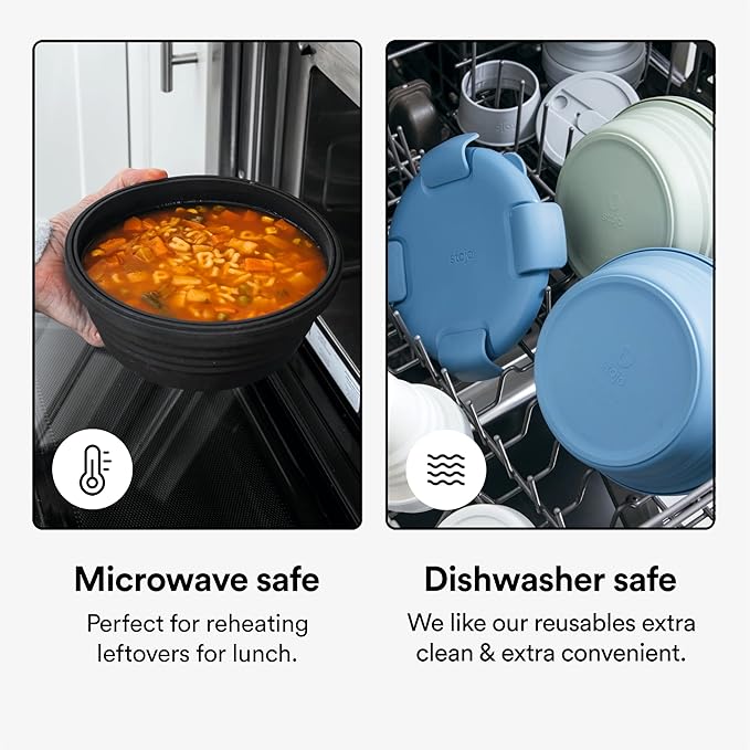 - Collapsible bowl: It’s literally never been easier (or more fun) to prep, store, and take food on the go! This compact bowl collapses down to just 1.3 inches. The 36 oz Stojo Bowl holds up to 4.5 cups, and is made for the kitchen as much as the commute. It stores nested and flat to save space, then pops open to upgrade your meal prep, leftovers, and work lunches. This Oat container is going to look right at home in your kitchen cabinet.