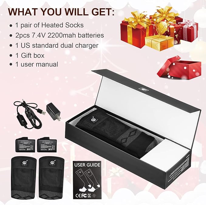 - 【7.4v 2200mah Batteries&3 Settings Temperature Controller】Battery socks powered by with 7.4V 2200mah rechargeable lithium battery packs,full charge around 3-4 hours,duration 3 - 8hours with 3 heat setting. controller LED red is for high temperature,white for medium temperature,blue for low temperature.you can easily adjust the temperature.