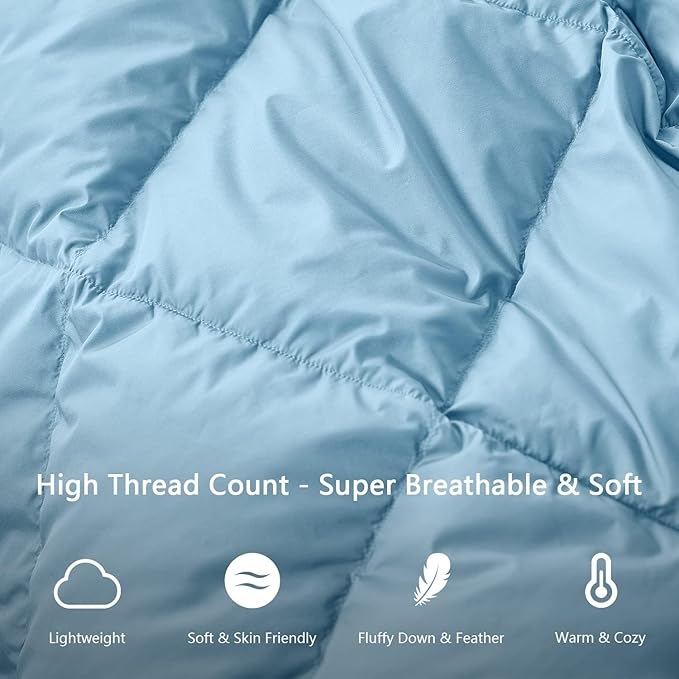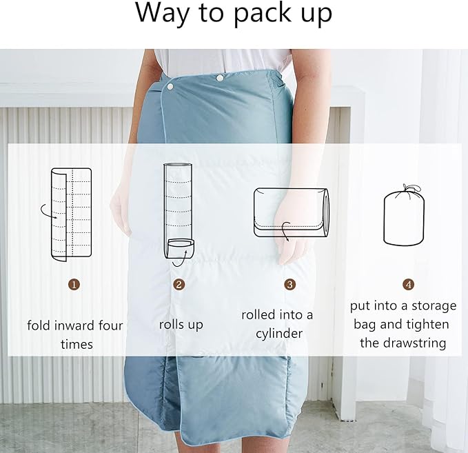 - COMFY BLANKET: A piece of storage bag is included. The cover of soft the down blanket is made of selected nylon fabrics and it’s filled with feather down and down fiber. This warm and packable blanket with creative design is ideal for many situations.