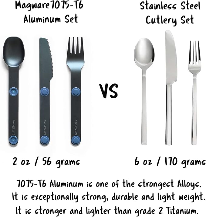 - ✔ EASY TO USE: Single-use plastic cutlery and wooden alternatives are not just unsustainable, but also unhygienic and hard to use. Magware's portable travel cutlery set with case takes away the hassle of tiny, fragile knives, forks, and spoons. Our 2mm thick 7075-T6 aluminum is a durable, strong, and ultra light weight metal - lighter than titanium and 1/3 the weight of stainless steel.