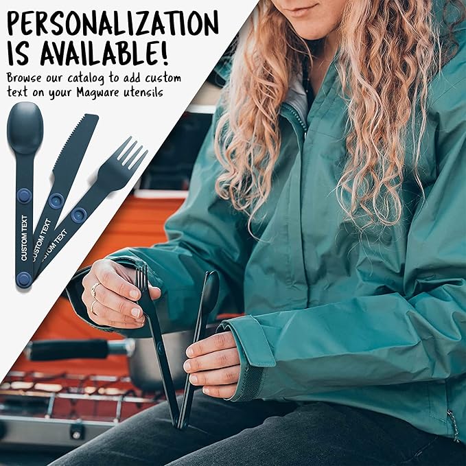 - ✔ CONNECT MAGNETICALLY: Embedded magnets allow MAGWARE silverware sets to connect tightly together for secure packing and organized storage. This allows you to join as many camping cutlery kits together as you wish. Take as many sets as needed for the family in one tidy bundle. No more hunting through drawers for that one knife, fork, or spoon that went missing from your three-piece kit.
