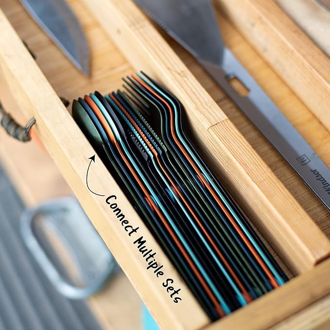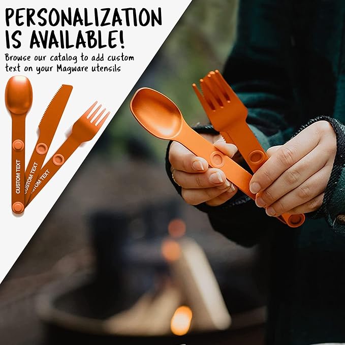 - ✔ CONNECT MAGNETICALLY: Embedded magnets allow MAGWARE silverware sets to connect tightly together for secure packing and organized storage. This allows you to join as many camping cutlery kits together as you wish. Take as many sets as needed for the family in one tidy bundle. No more hunting through drawers for that one knife, fork, or spoon that went missing from your three-piece kit.