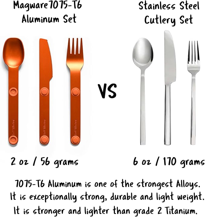 - ✔ EASY TO USE: Single-use plastic cutlery and wooden alternatives are not just unsustainable, but also unhygienic and hard to use. Magware's portable travel cutlery set with case takes away the hassle of tiny, fragile knives, forks, and spoons. Our 2mm thick 7075-T6 aluminum is a durable, strong, and ultra light weight metal - lighter than titanium and 1/3 the weight of stainless steel.
