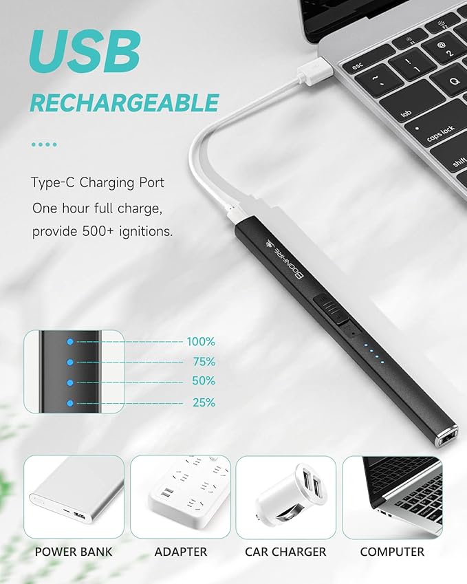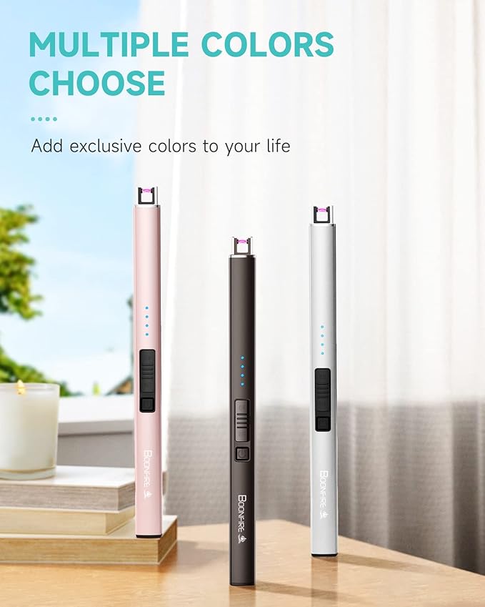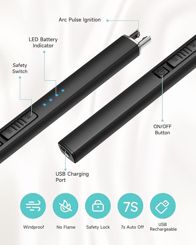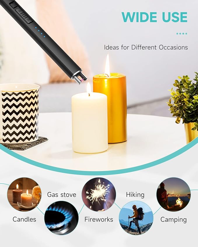- 【Electronic Candle Lighter】Candle lighter has ARC technology. Made of zinc-alloy, durable and fast to cool down after use. Electric lighter without gas required, no fluid required, no flame. The windproof and splash-proof design of the electric arc lighter ensures that you can easily use it under any weather conditions