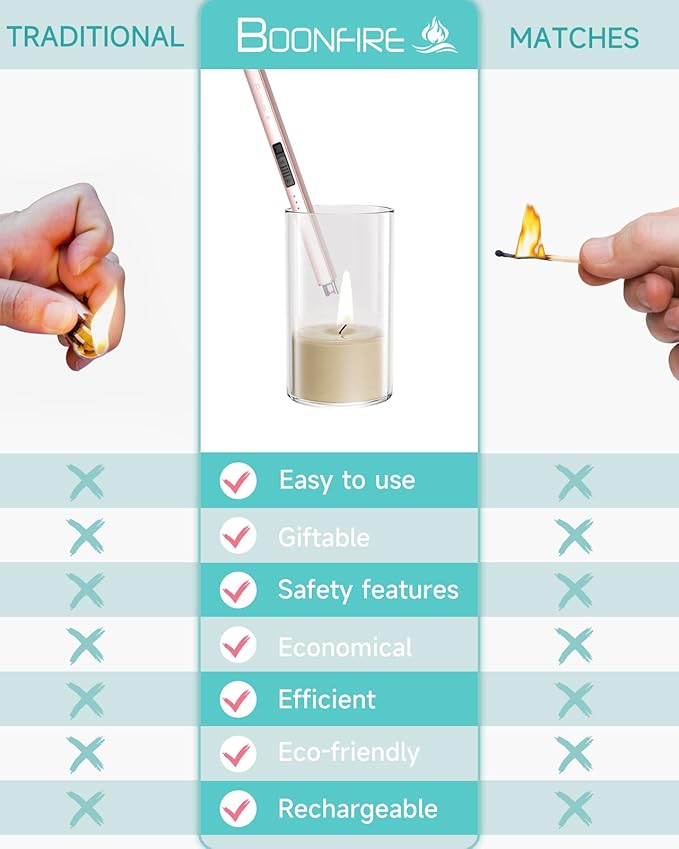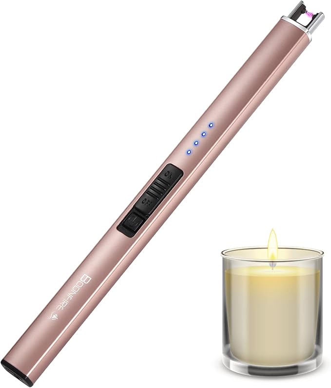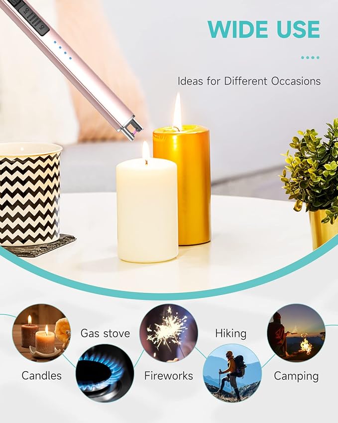 - 【Electronic Candle Lighter】Candle lighter has ARC technology. Made of zinc-alloy, durable and fast to cool down after use. Electric lighter without gas required, no fluid required, no flame. The windproof and splash-proof design of the electric arc lighter ensures that you can easily use it under any weather conditions