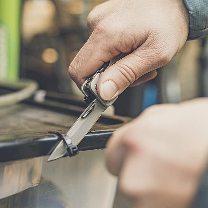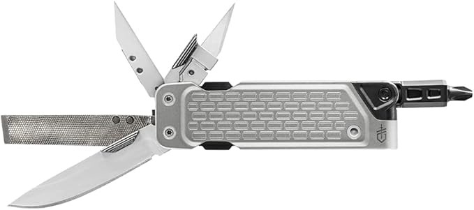 - 7-IN-1 MULTI-TOOL: Features a plain edge blade, 2-sided 1/4" bit driver, cross driver, medium flathead, coarse and fine file, chisel edge, awl, replaceable No. 11 utility blade, and pocket clip