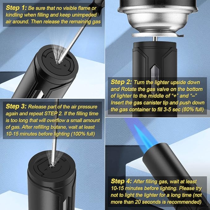 - 🔥【Butane Torch & FUEL VISIBLE WINDOW】- Butane Lighter has 2.8g gas capacity to ensure long lasting use.Don’t worry about when to refuel gas to the lighter, shake the lighter to see residual fuel from the visible window, Tilt lighter back and forth to see a bubble in the liquid Butane, you can check and fill it at any time. Note⚠️!!! Excessive filling will cause butane leakage. When first filling, please use a tool to press the bottom inflation port to release excess air.