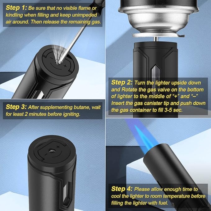 - 🔥【Torch Lighter & Gift Idea】The 6in long torch lighter is easy to carry, and comes with a lanyard which is convenient for you to hang it in a safe place. The lighter gift box has a beautiful design which is a great gifts idea for friends, Christmas Day, Birthday. You can use it according to the intended applications such as grill, candle, BBQ, camping, baking, fireplace, soldering or DIY jewelry.