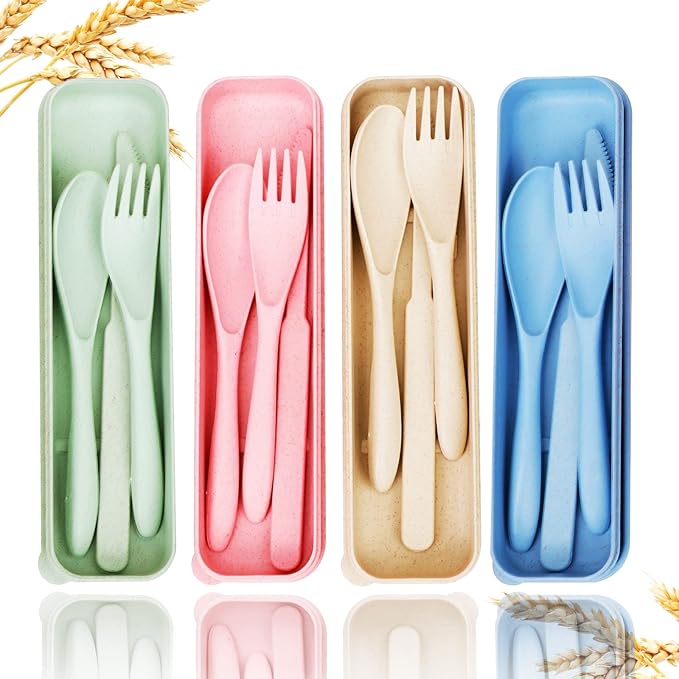 Reusable Travel Utensils Set with Case, 4 Sets Wheat Straw Portable Knife Fork Spoons Tableware, Eco-Friendly BPA Free Plastic Cutlery Travel Picnic Camping Utensils for Kids Adults Daily Use
