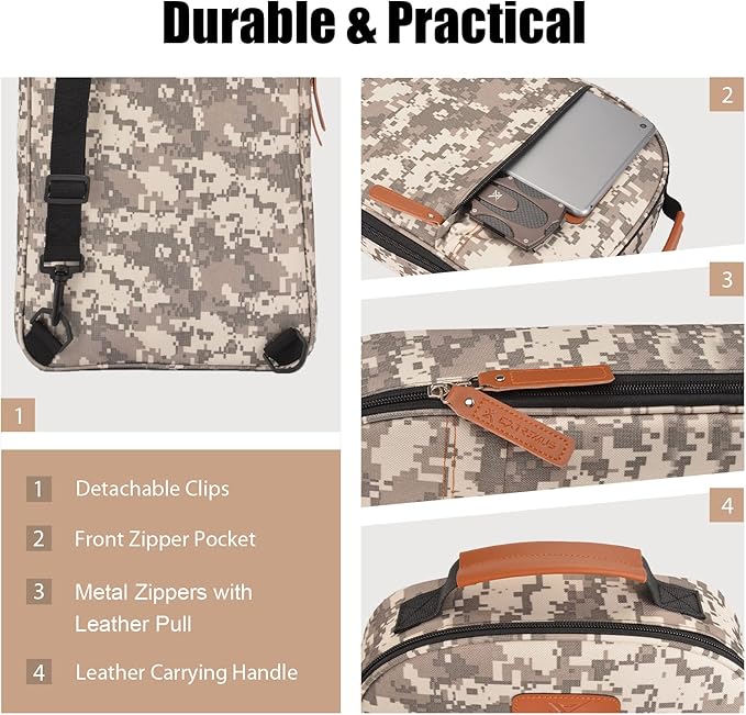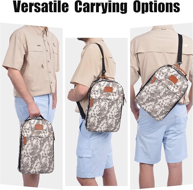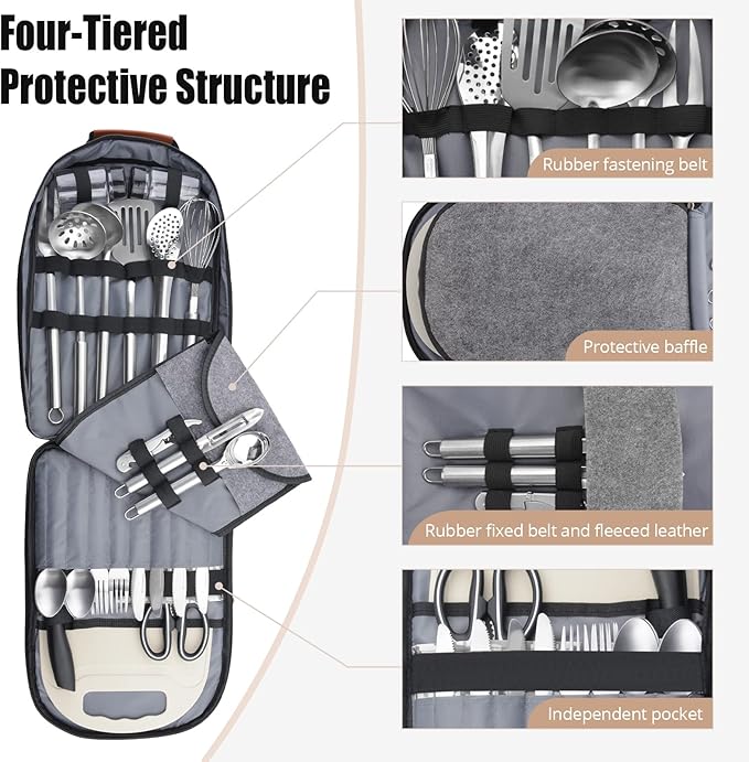 - Lightweight and Portable - This portable camping kitchen utensil set is compact, lightweight, and easy-to-carry. The camping backpack weighs under 4 lbs. Ideal for campers on the move, this backpack has 3 carrying options with a reinforced leather stitched carrying handle for hanging and holding, plus an adjustable shoulder strap to wear on your shoulder or as a cross-body bag. The camping cooking utensil backpack also has dual metal zippers with leather pull-tabs for easy opening and closing.
