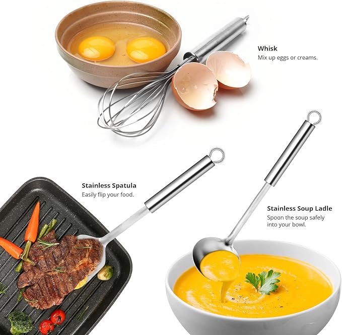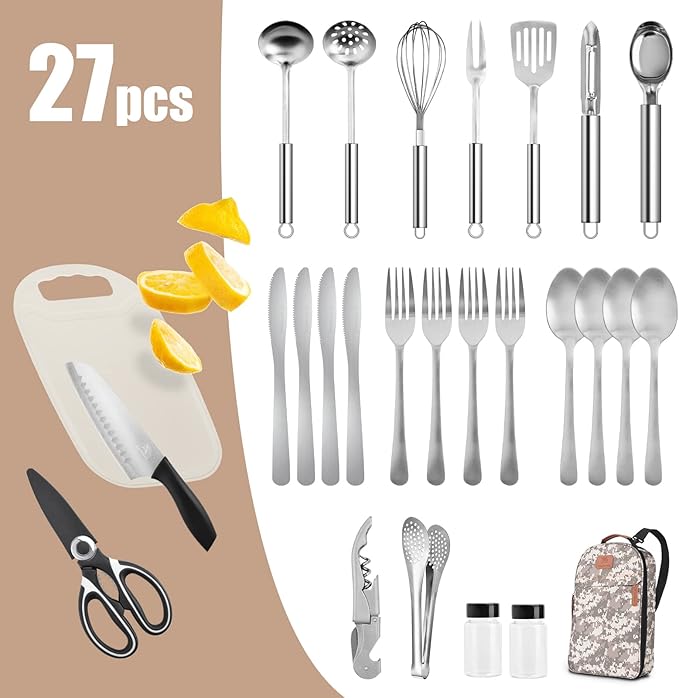 - Stylish Design - These camping cooking utensils are 100% stainless steel with a sleek chrome color finish for each cooking utensil. This camping cooking set comes in convenient color schemes that fit your outdoor aesthetic, so choose one that suits your style. The camping kitchen utensil set makes a great gift for campers, hikers, nomads, or anyone who appreciates an outdoor lifestyle.