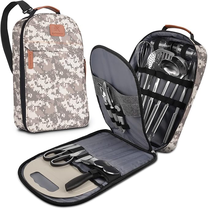 Extremus 27 Pcs Camp Kitchen Cooking Utensil Set Cookware Kit - Travel Organizer Grill Accessories Portable Compact Gear for Backpacking BBQ Camping Travel,Camping Accessories,Earth Digi Camo