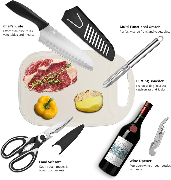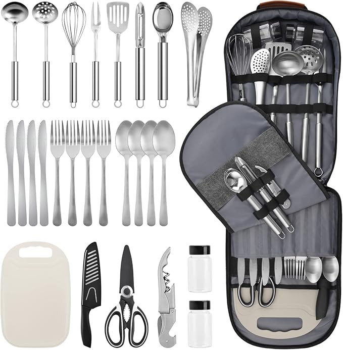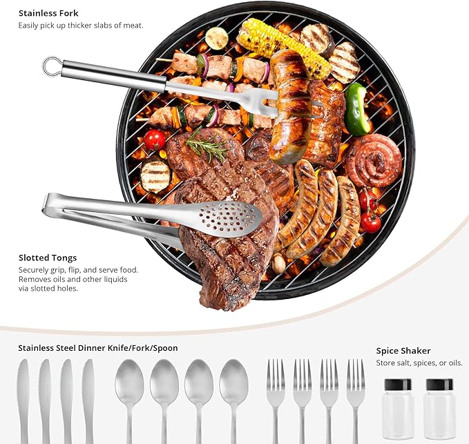 - Take Anywhere You Go - Built for everyday food preparation, this camping kitchen utensil set can travel with you anywhere you cook. Whether you’re out grilling burgers on a campground with the tongs and fork, cooking fish on a boat with the knife and cutting board, preparing dishes in an RV with the spice shakers and ladle, or just enjoying a meal in your backyard with the kitchen set, these portable camping utensils will fit all your cooking needs.