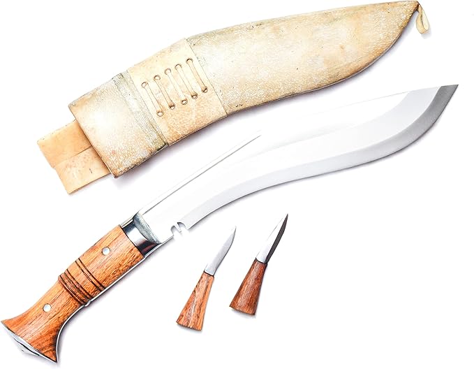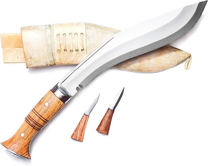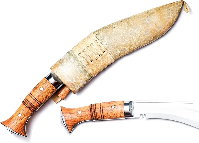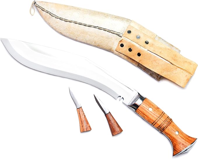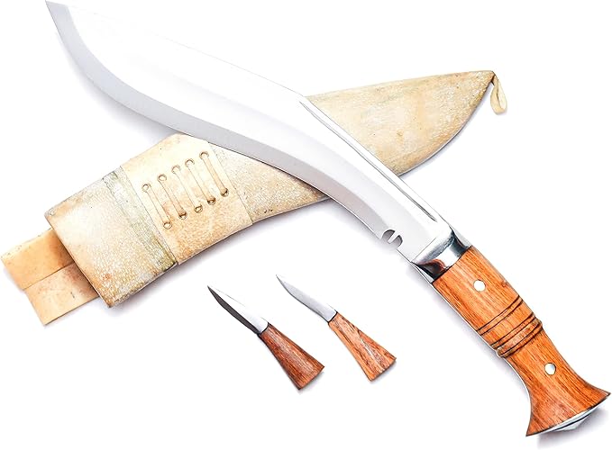- Well Balanced Rosewood Handle – The 5' rosewood handle forms a perfect symmetry with the 10' blade providing a firm and balanced grip. Two pieces of rosewood are glued on both sides of the full flat tang and riveted firmly to make it a heavy duty weapon. The neck is secured and epoxied by steel bolster. The raised band in the middle provides a firm grip and a classic hand stopper to avoid cuts and a flared pommel to prevents the khukri from slipping through the end.
