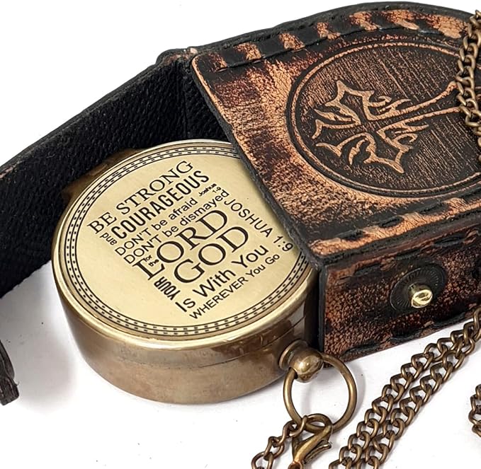 - Product Specifications: The Antique Decor Compass and Case Set has a removable chain that can be attached to a ring at the head of the compass vintage gift. It is engraved with the psalm “BE STRONG and COURAGEOUS DON’T be afraid DON’T be dismayed for the LORD YOUR GOD Is With You WHEREVER You Go – Joshua 1:9”