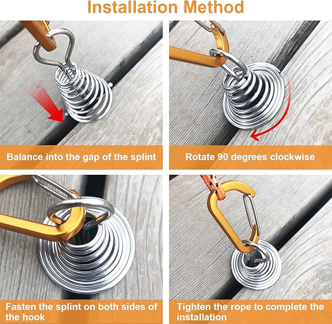 - [Easy installation] D-shaped carabiner is attached, which is convenient for you to fix the tent on the octopus deck nails. The installation method is very simple. Just insert it into the gap and rotate it to fix it. Binding with D-shaped carabiner and tent rope. Note: Please ensure that the deck gap is larger than 2.03mm and less than 30.43mm before use.
