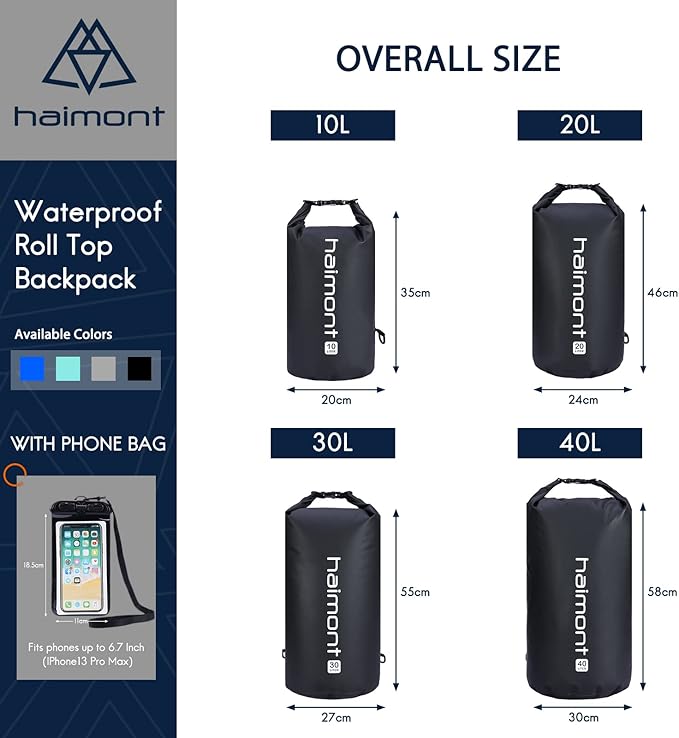 - Versatility: Haimont dry bag can float on water after being rolled and buckled, so you can track your gear easily, no more worrying about your items getting wet. Suitable for boating, kayaking, paddling, sailing, canoeing, surfing, or having fun on the beach