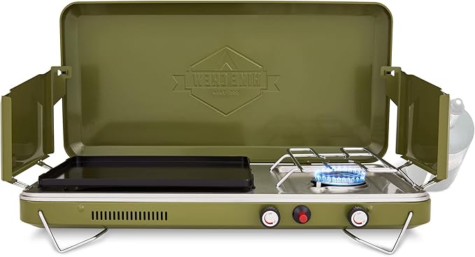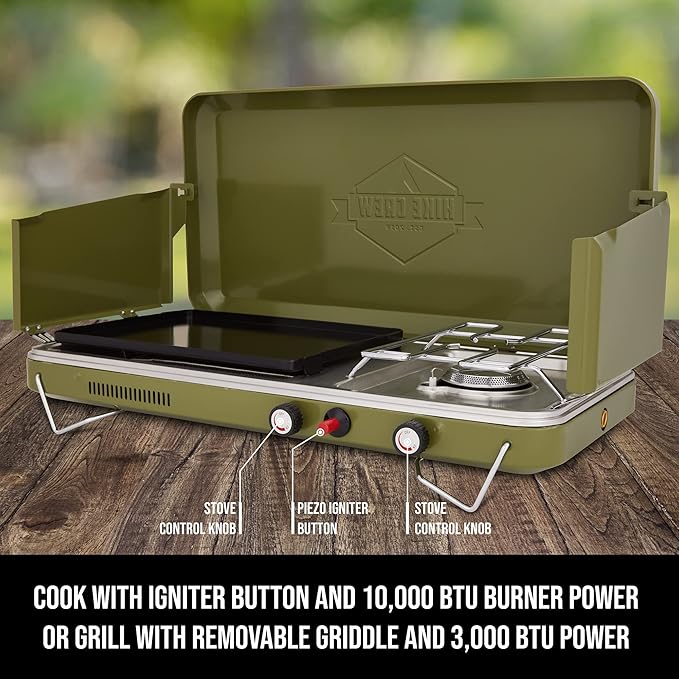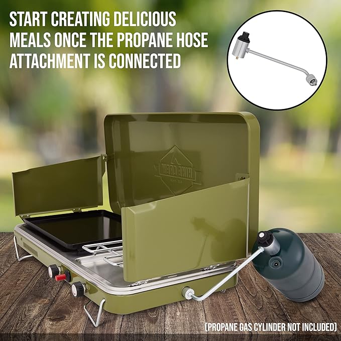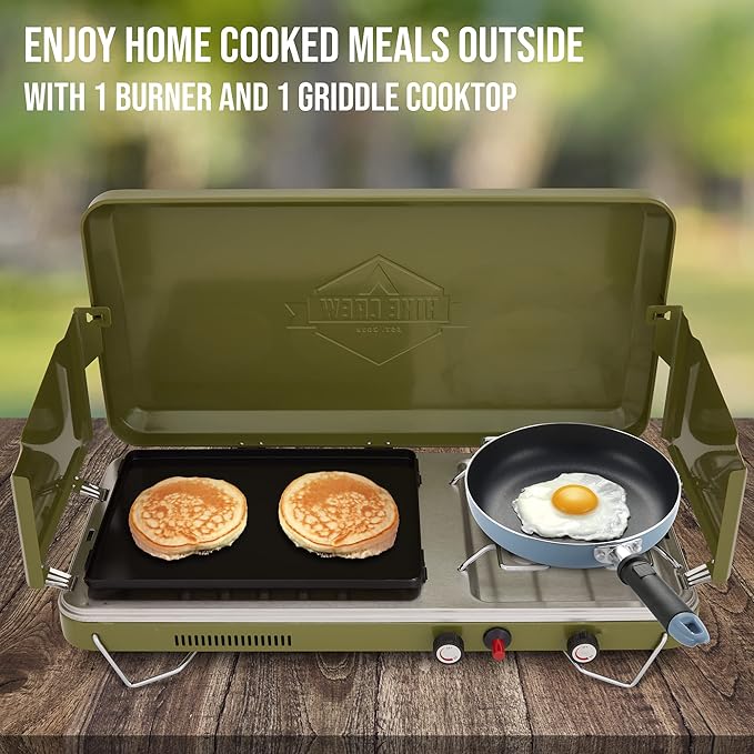 - COOK ANYTHING IN THE GREAT OUTDOORS | Powerful Propane-Powered 2-in-1 Grill Features a 10,000 BTU Single Burner Cooktop & 3,000 BTU Griddle for Amazing Outdoor Cooking Convenience | Perfect for Preparing Steaks, Burgers, Eggs, Bacon, Sausage, Pancakes, Coffee, Soup & Other Meals While Camping & Beyond