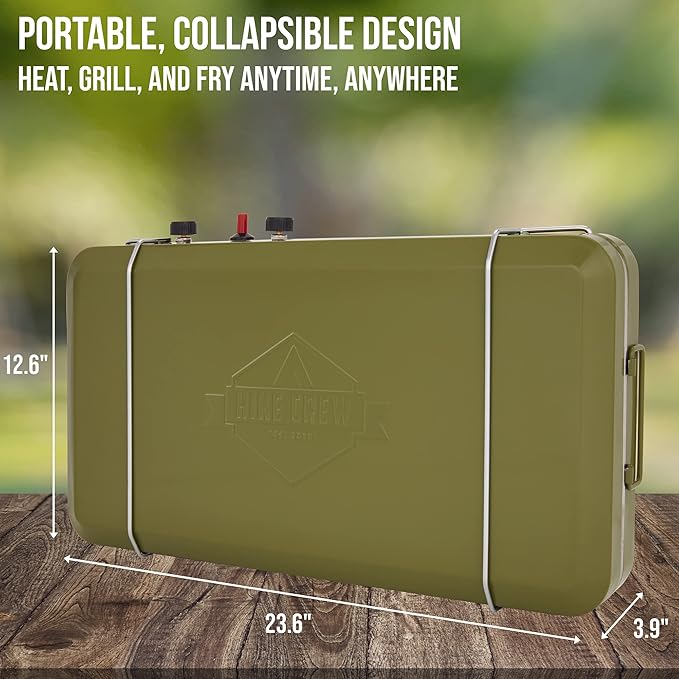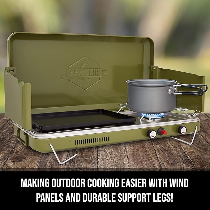 Hike Crew 2-in-1 Gas Camping Stove | Portable Propane Grill/Stove Burner w/Integrated Igniter & Stainless Steel Drip Tray | Built-in Carrying Handle, Foldable Legs & Wind Panels | Includes Regulator