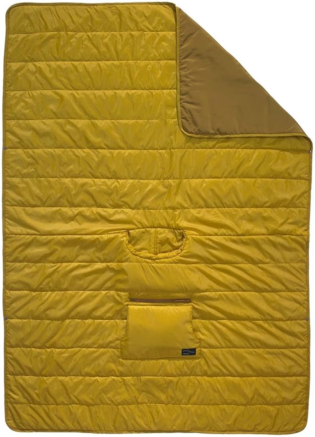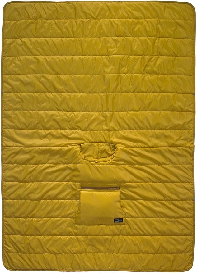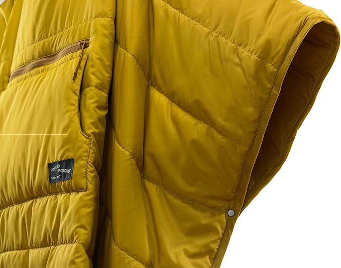 - Synthetic-insulated hooded poncho that can either be worn, or laid on the ground as a blankets