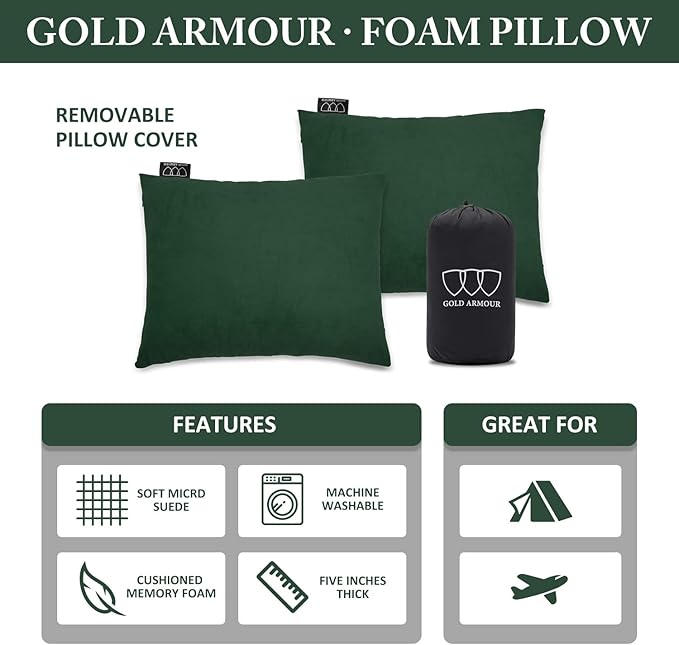 Gold Armour Camping Pillow Memory Foam - Compact Compressible Backpacking, Hammock, and Travel Pillows for Kids and Adults - Essential Outdoor & Camping Gear (Medium 14x18in, Green)