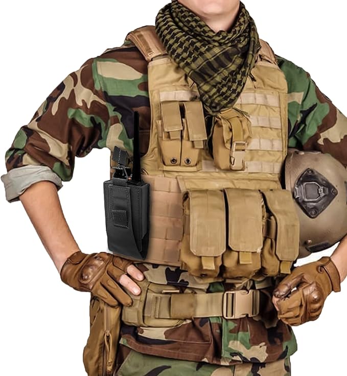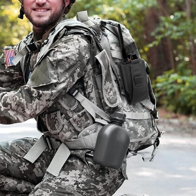 - 🔫Molle system: Molle radio pouch can be easily connected to any molle-compatible tactical vest, backpack, belt and other equipment.⚠Note: The American flag patch is pasted on the inside of the radio pouch and can be peeled off and pasted on the outside when using it.